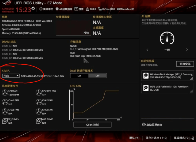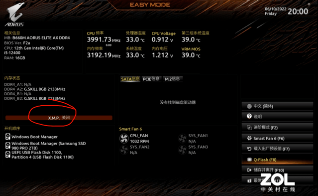 打开需要在BIOS中操作,进入主板BIOS界面,一般打开后按F2或DEL进入,找到相应的XMP选项按钮即可打开,每个主板的BIOS界面都不一样,但实际上都差不多,都支持中文图形界面调整。