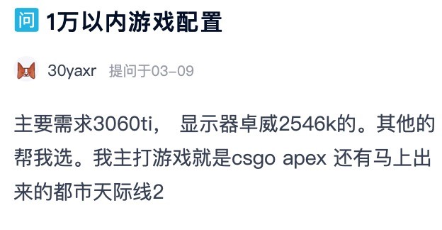 万元预算装机,这没啥新鲜的吧?但要把需求落实,可能就没那么简单,例如下面的这位网友的提问,要求显示器是卓威2546K,显卡要RTX3060Ti,这怎么装机比较合理?毕竟这台显示器就要4000多元了,RTX3060Ti显卡价格也在3000元左右。