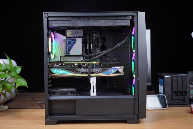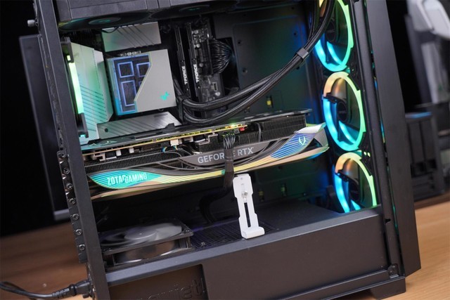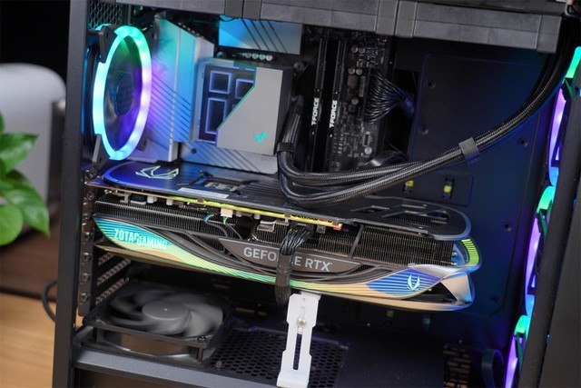 索泰RTX4090 AMP EXTREME AIRO机身上搭载的SPECTRA 2.0 5区ARGB灯效。实际点亮后,效果非常的优秀。空气动力美学的机身设计,让这款显卡的颜值无与伦比,可以说是索泰这几年最漂亮的显卡也不为过。金属背板,高端显卡的标配,不仅提升了显卡的强度,也可以增加显卡的散热能力。这款显卡相比于前代风扇扇页面积增加了50%,风扇高度增加60%,鳍片高度增加了30%,为了散热在有限的空间里做到了极致。