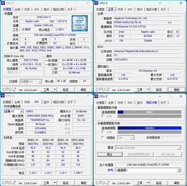先来看看整机的配置,以及在XMP开启后,正常6000MHz下的CPU-Z的性能表现。CPU-Z简单跑个测试,单核860、多核12529.6,性能非常强悍。