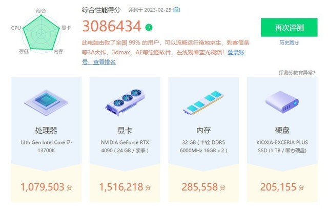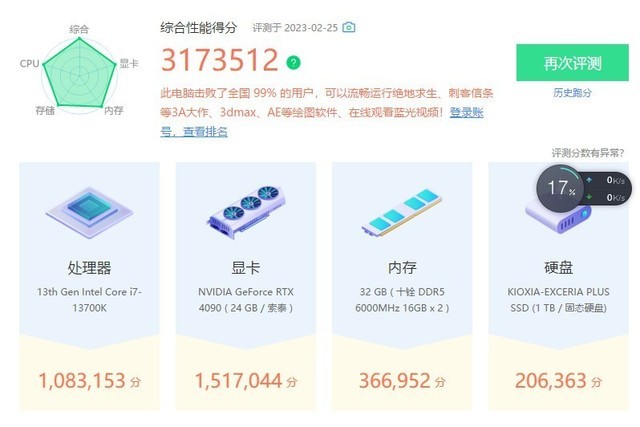 开启DDR5内存高带宽&低延迟模式后,内存得频率依旧为6000MHz,娱乐大师跑分为3173512,其中内存得分为366952。