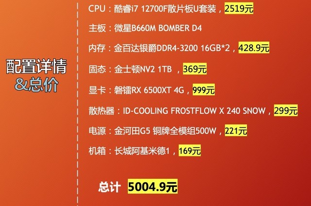 最后核算总价为5004.9元,虽然超了一点预算,但是加上满减等活动,还是可以5000以内的主机拿下的。