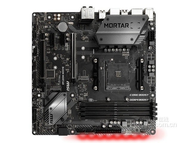 微星 B450M MORTAR支持双通道 DDR4 3466Mhz内存,4条DDR4内存插槽,最大内存容量达64GB。拓展方面,2个PCI-E X16显卡插槽,2个PCI-E X1插槽,都覆盖了PCI-E钢铁装甲,避免显卡弯曲与受到电磁干扰。2个M.2接口,4个SATA III接口。