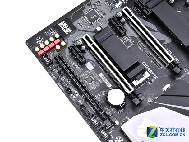 在显卡插槽周围是两个M.2接口,都装备了金属散热装甲,在装甲背面也有导热垫辅助散热。