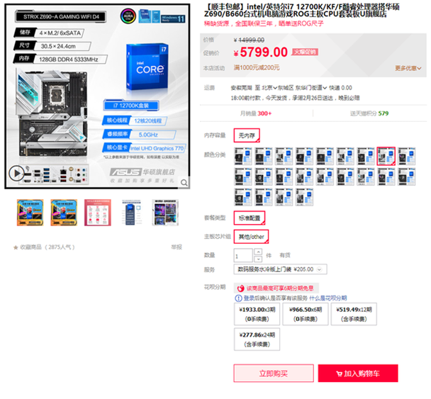 且天猫商城还有华硕Z690吹雪D4主板搭i7-12700K处理器套包,5799元火爆促销中,可享满1000元减200元优惠及6期免息福利,晒单还送ROG尺子。