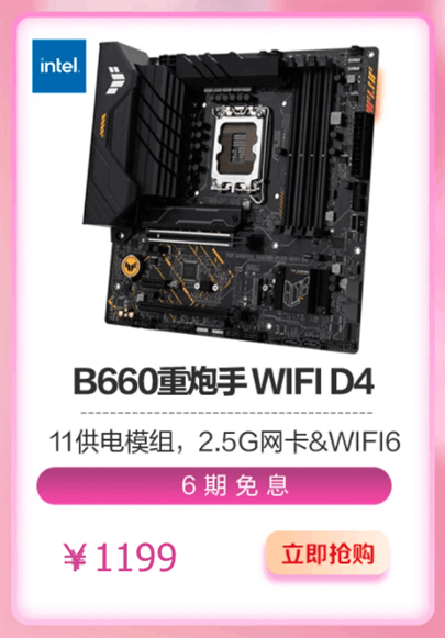 此外还有不带WiFi6无线网卡的华硕 B660重炮手D4主板可入手,玩家可根据需求选择。现关注该主板京东店铺,可享粉丝价999元,还有6期免息福利。购买链接http://item.jd.com/100031223666.html