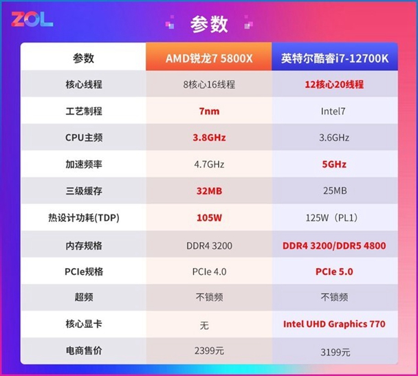 此次我们使用锐龙5000中热门型号AMD 锐龙7 5800X与12代英特尔 i7-12700K做个测试,看看选择AMD 锐龙7 5800X与英特尔 i7-12700K的游戏性能差异,用游戏实测验证AMD 锐龙7 5800X打造平台是否更合算。评测之前我们按照惯例先上看一下这三款处理器参数。