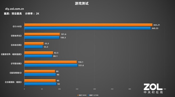 首先看一眼现阶段主流的2K分辨率帧数,AMD 锐龙7 5800X在《行尸杀机5》,《墓穴魔法门暗黑》三款MMORPG中帧数不如英特尔 i7-12700K,但在《伊布全世界暗黑天堂》、《Naohito无极》、《尤达冒险》和《CS:GO》4款手机游戏帧数都要高于英特尔 i7-12700K。看来Zen3架构处理器对比12代酷睿在手机游戏上依然有一战之力,甚至一些游戏有更强的帧数整体表现,这是因为Zen3架构整合了缓存,让CXX核心可以直接读取缓存数据,极大提升处理器能效,在现阶段普遍需要多核协作的手机游戏中,Zen3架构会有更强的性能整体表现。但是AMD 锐龙7 5800X在锐龙5000中也是特殊存在,只有它拥有一颗完整CCD核心,里面的8个CXX避免了延迟问题,这款处理器在游戏性能整体表现中也是锐龙5000系列中最好的一个。