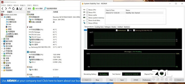 最后我们使用AIDI64进行拷机测试,此次使用压阻抗最大的FPU单拷,看看铭瑄 B660M主板的抗压能力。