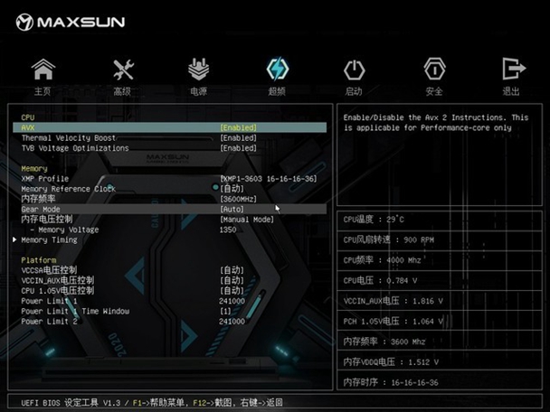 铭瑄 B660M主板现阶段已经拥有完善的图形化BIOS,便于用户进行超频整地。