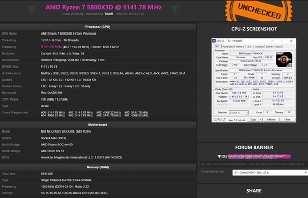 AMD 锐龙7 5800X3D前两天正式宣布解禁,这款处理器配备了3D V-Cache技术,三级缓存拼接到了96MB, 但缓存减少也会带来咳嗽功耗等问题,AMD 锐龙7 5800X3D在频率上对比锐龙7 5800X略有减少,但是锁住了超倍频能力。但日前海外大神玩家TSAIK通过拉外频的形式将AMD 锐龙7 5800X3D超频至5.1GHz以上。