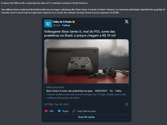 有消息指出,Xbox正在巴西市场逐步减少Xbox Series X主机的供应,并计划最终停止向该地区提供这款产品。这一消息得到了其他渠道的证实,据称微软将不再为巴西市场补充Xbox Series X库存。目前,这款主机在巴西的售价相对较高。