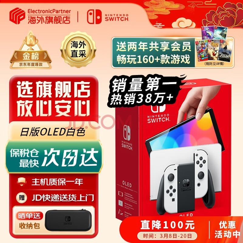 任天堂(Nintendo)【国内保税仓】Switch OLED/续航加强日版/港版便携家用ns体感游戏掌机 日版OLED白色64GB(加赠2年会员)