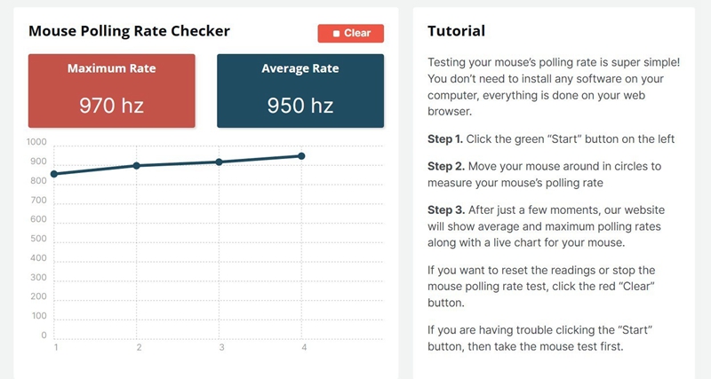 想要看自己的鼠标回报率也很简单,打开http://devicetests.com/mouse-rate-test页面,点击start开始之后,用鼠标在屏幕上快速移动,显示的Maximum Rate就是鼠标的回报率。