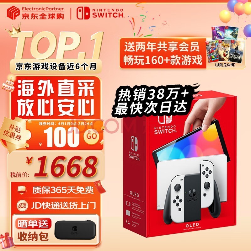 任天堂(Nintendo)【国内保税仓】Switch OLED/续航加强日版/港版便携家用ns体感游戏掌机 日版OLED白色64GB(赠共享会员)