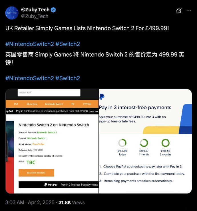 而在近期的爆料中,有用户称英国零售商Simply Games已经在其网站上将Switch 2的售价标注为499.99英镑(约合人民币4700元)。但这一价格明显要高于此前舅舅党们预测的400美元(约合人民币2900元),那么Switch 2的售价到底如何呢?今晚21点见分晓!