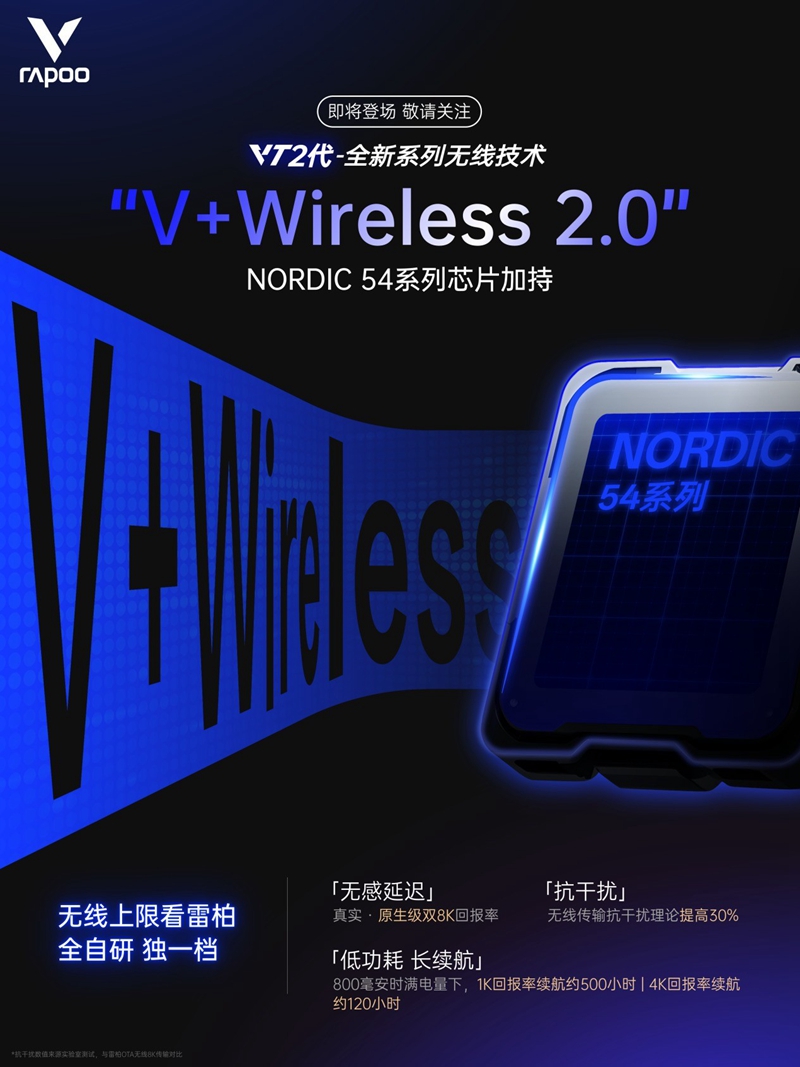 雷柏VT二代无线电竞鼠标,第五张底牌搭载NORDIC 54系列全新下一代芯片,全系「V+Wireless 2.0无线电竞算法」亮剑,先刷重点。