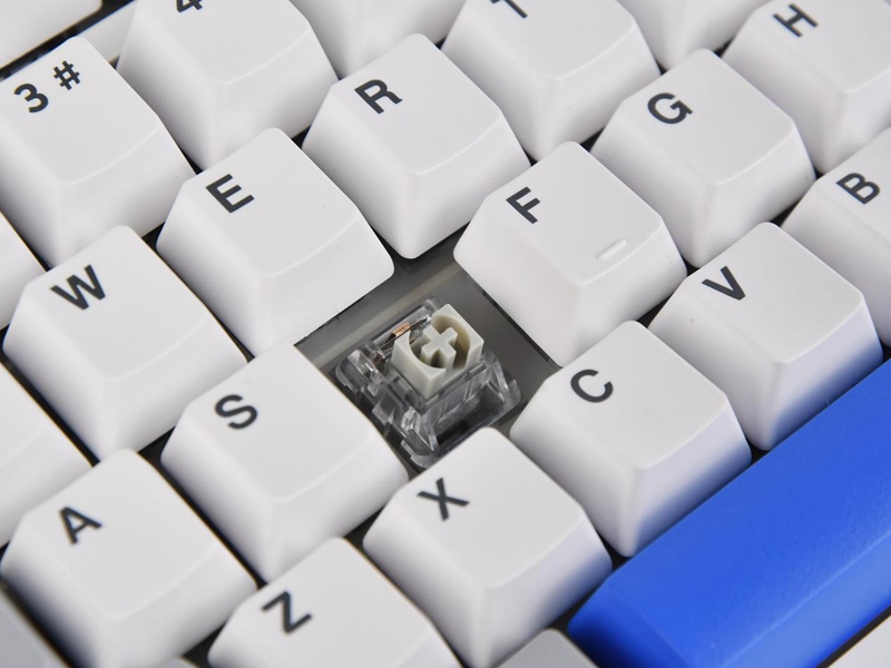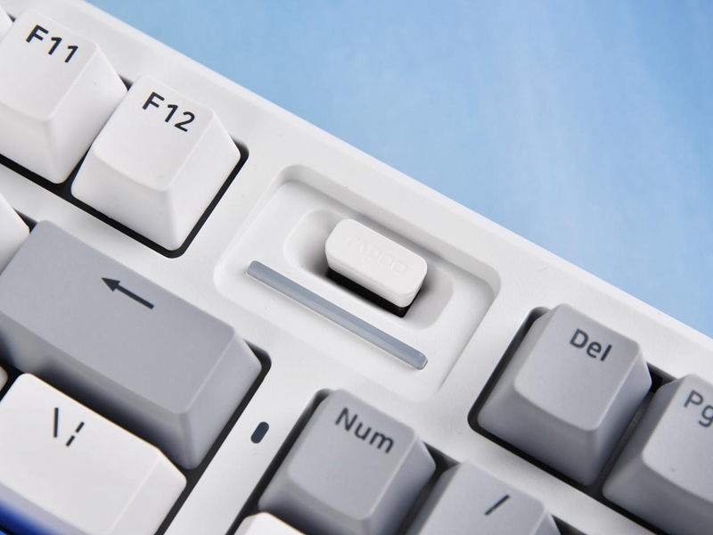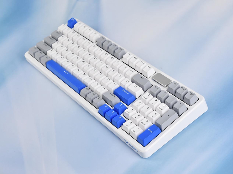 雷柏 V700DIY-98机械键盘采用了清新简约的白灰蓝配色方案,整体造型流畅自然,颜色搭配现代感十足。键盘的主色调为白色,配以灰色的功能键和深蓝色的关键字键,既简洁又不失精致。键帽使用双色注塑工艺PBT材质,触感干爽,反馈较为硬朗。优秀的材质在长时间使用过程中也不会出现字符磨损和打油的现象,保障手感稳定。