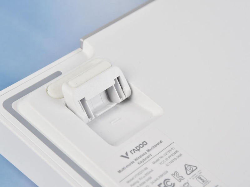 雷柏 V700DIY-98机械键盘的Type-C接口和模式切换开关被放置在上方左侧,略微凸起。中间则是左右对称的长金属装饰条。