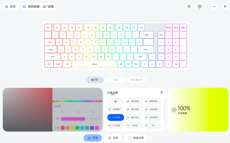 开启灯效后,按键下轴体的灯光、导光条以及底面灯带洒出的色彩相映成趣,即使在外观内卷非常激烈的客制化外设领域,也是很不错的设计和颜值。