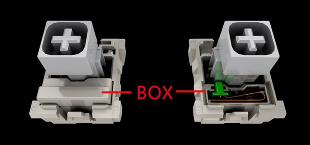 此外,还有一种比较典型的机械轴体,那就是凯华BOX轴。这种轴体采用了BOX技术,将轴体内的一些小零件都被“关”在一个房间里,凯华创造了一个“盒子”将它们装起来,形成防水防尘的环境。加了BOX结构后,除了防水防尘之外,通过改变触发,对触点金属片也有很好的保护。原有的触发是通过上下积压的方式,完成一次触发需要上下两次积压金属片,而现在通过BOX轴“小绿点”推的形式,完成一次触发只需要变形一次,所以从理论上来说,如果其它零件不损耗的情况下,BOX轴体的寿命是Cherry轴的2倍。