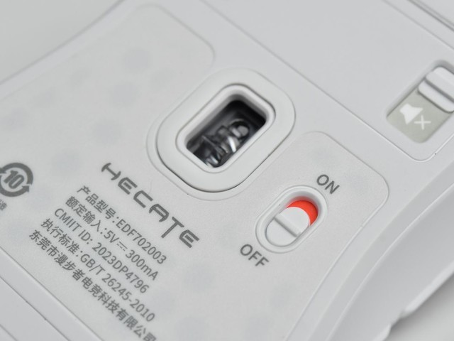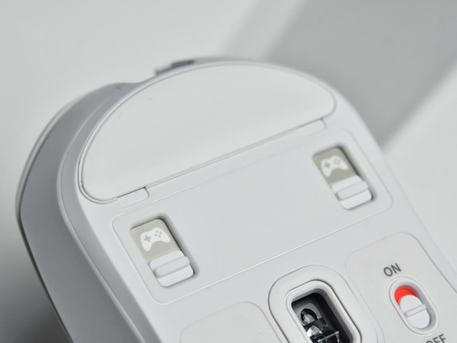 漫步者 G3M Pro三模无线游戏鼠标的左右主键部位预装了针对游戏场景的方形微动,以及针对办公场景的贴片微动,并通过底部物理开关来切换。目前市面上采用此方案的鼠标比较少,以笔者个人的经历来说,上一款使用类似设计方案的鼠标是主打办公的产品,它与漫步者 G3M Pro不同的是,采用旋转整个主键模块的方式来完成微动切换。这种方式带来的问题也明显:我在使用时要将圆盘旋转到极限位置才能完成微动切换操作,否则会导致两颗按键完全失效,想法是好的,但在使用体验上会打折扣。