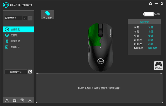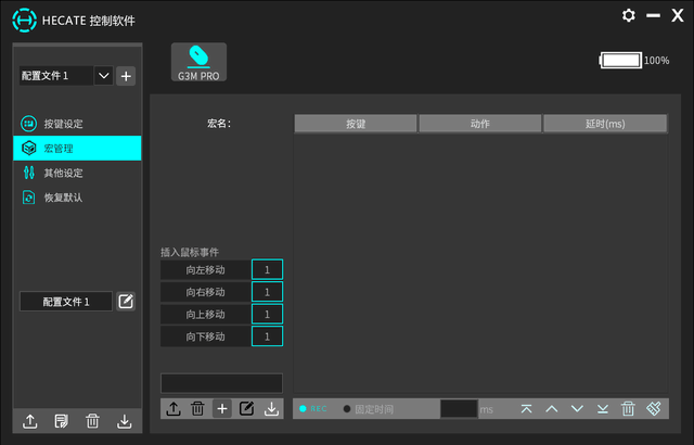 漫步者 G3M Pro三模无线游戏鼠标配备了官方驱动,这款软件的操作思路很简洁,学习成本低,并可以设置鼠标的按键功能、宏和DPI数值。在按键设定界面中,我们可以对鼠标的按键进行自定义。宏管理界面中,可支持宏命令录制、编辑功能,可以简化我们日常的操作步骤。