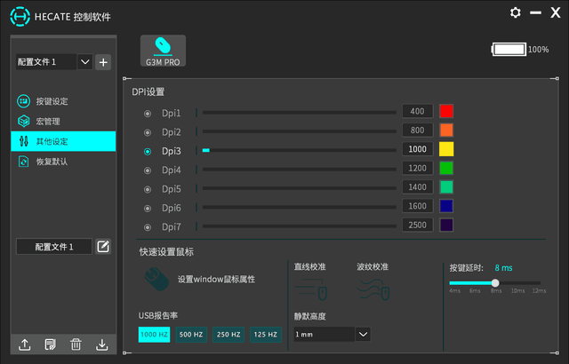 其它设定中,我们能够以50DPI为步进来调整鼠标的分辨率。还支持调节静默高度、直线校正、波纹校正、报告率调整,以及按键响应时间调整,玩法非常丰富。