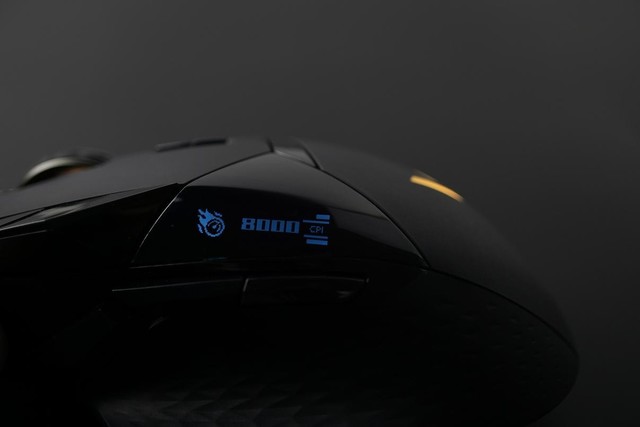 客制化OLED显示屏,通过驱动可让屏幕显示自定义文字、自定义图案、性能参数等,0.87英寸显示屏打造玩家属于自己独一无二的slogan;约1680万色可调RGB背光,透过品牌logo与金属滚轮处漏出,色彩氛围,点缀对局高光时刻!