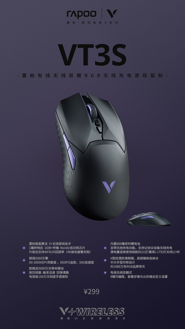 雷柏智能算法V+无线游戏技术,4K无线电竞游戏技术,雷柏 VT3S双模无线充电游戏鼠标,官方售价299元。