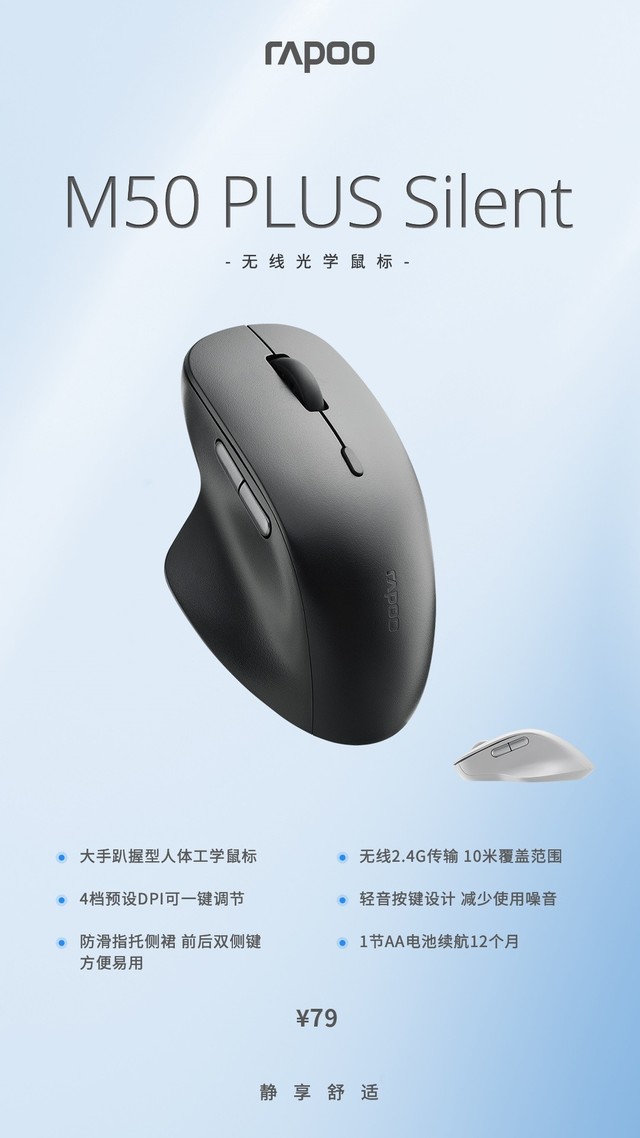 近日雷柏推出了以大手趴握型人体工学,4档预设DPI可一键切换,防滑指托侧裙前后双侧键加持,2.4G的无线连接,兼具轻音按键设计以及12个月的续航时间的雷柏 M50PLUS Silent无线光学鼠标横空出世,为商务办公人群带来更好的舒心便利体验,79元全新上市。