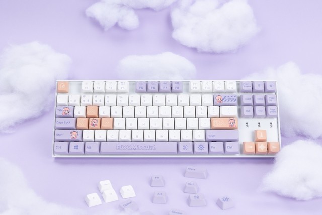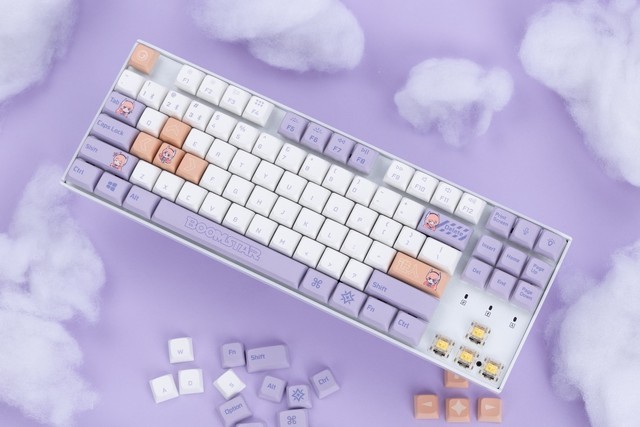 影驰x Keychron 联名星曜娘主题K8 PRO机械键盘,采用了87键经典TKL布局,主体采用了白色方案,配以紫色与橙色作为点缀。部分键帽外表形象改为影驰星曜娘和星曜主题LOGO,小清新配色少女风十足。连接方式上,支持TYPE-C有线连接与5.1蓝牙无线模式,切换键设置在侧面,MACOS和WIN双系统布局支持。与星曜系列强调的DIY定制属性一样,全键盘支持热插拔,可更换大部分主流轴体,随时享受DIY的无穷乐趣。