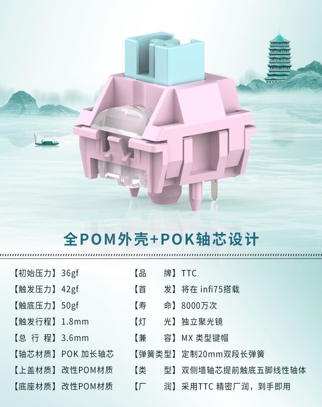 TTC 西子轴是一款线性轴体,参数设定为42gf触发压力,1.8mm触发行程,3.6mm总行程;配备定制20mm双段长弹簧,轻柔按压,回弹跟手;具有独立的聚光镜加持,轴体透光效果显著,键盘RGB灯效耀眼。设计加长轴芯提前触底,点触之间,开启美好享受。