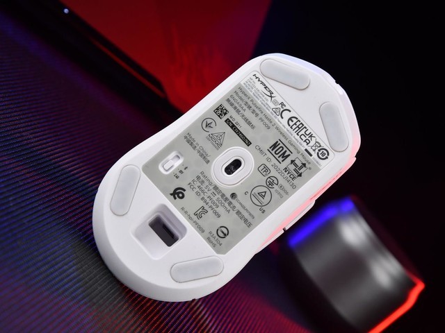 HyperX 旋火2游戏鼠标系列的底部依旧做了打孔。但打孔部分贴上了信息贴纸,在视觉方面可以保证一体性,并设置了电源开关和接收器收纳槽。另外,这款鼠标还使用了PTFE材质脚贴,数量为4块。并且官方依旧在附件中提供替换装,方便后期维护。