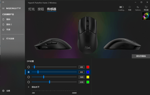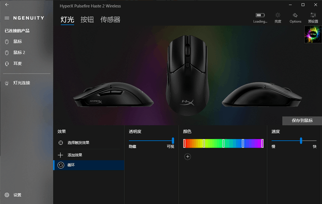HyperX 旋火2鼠标支持HyperXNGENUITY驱动。这款驱动可设置灯光、按钮、传感器,还可以显示鼠标电量,调整灯光亮度、切换配置文件等。灯光界面中能够调整灯光模式,如呼吸、循环或者纯色,这款鼠标支持1680万色RGB背光调节,所以我们可以在调色板中调节多个自己喜欢的颜色。鼠标依旧只有滚轮一个发光区域,在视觉上看上去没那么单调了。