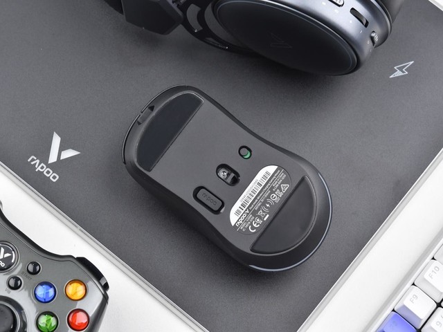 鼠标底盖采用一块平整的ABS材料,并设置了接收器收纳槽、传感器以及电源开关。底盖上下部分各配备一块大面积特氟龙脚贴,可让操作更加跟手。