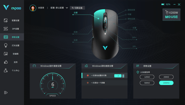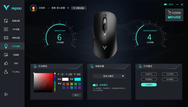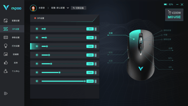 雷柏 V200W双模无线RGB游戏鼠标支持官方驱动,在驱动软件中,我们可找到DPI调节、按键功能、灯效模式调节等。