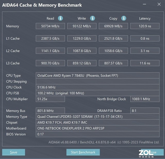 首先测试了一下OneXPlayer 2Pro EVA联名限量版三合一电脑游戏机搭载的LPDDR5X 7500MHz内存性能,使用AIDA 64进行内存跑分。