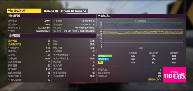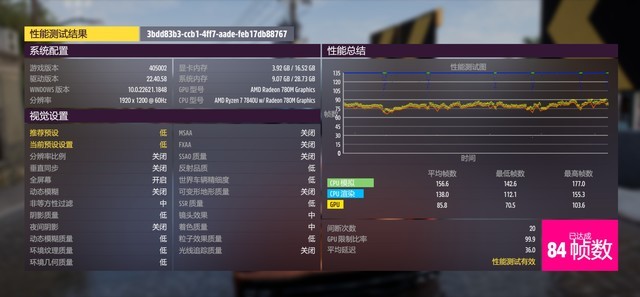 而在1920x1200分辨率和1280x800的分辨率下,这款游戏在低画质情况下达到了84帧和110帧,因此主要看玩家的需求,高分辨率也足够畅玩这款游戏,注重帧数可以适当调低分辨率,当然画质在玩这类3A时还是建议用低画质。