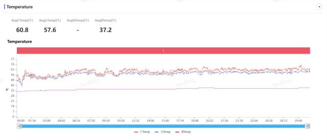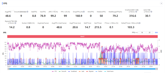 在室温25度的环境下,不使用散热背夹游玩半小时原神,通过性能狗采集游戏帧率,可以看到帧率全程都比较不稳定,19分钟时还出现了明显的掉帧现象;且随着游玩时间增加,手机温度也越来越高,电池平均温度超过了40度。
