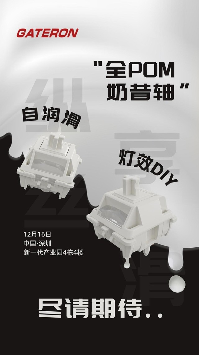 此外,我们的全pom机械轴也是此次发布会的亮点之一。这款全新的pom轴,以其卓越的手感和越用越顺滑的特性,赢得了大家的广泛关注。全pom轴的推出,再次证明了佳达隆在创新和品质上的决心,我们希望通过不断的研发和创新,为全球的机械键盘爱好者提供更多、更好的选择。期待在12月16日的发布会上与您相见!