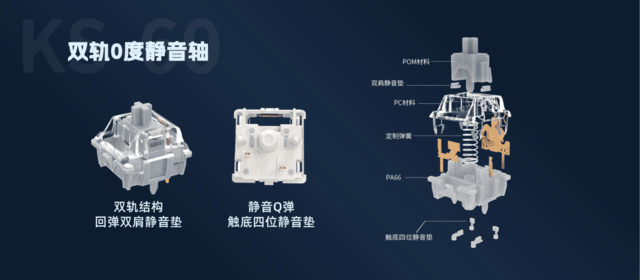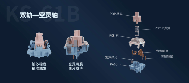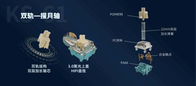 0度静音轴、探月轴,空灵轴都采用了佳达隆最新的双轨结构,根据名字不难看出三款轴体在保证稳定顺滑的基础上,又分别主打静音、线性HIFI、段落弹片发声。