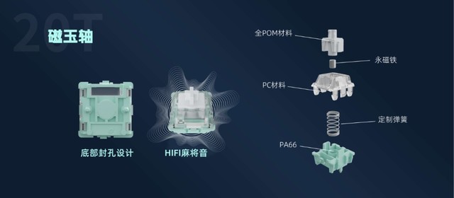 如图,我们可以看到两款磁轴的材质无论是轴芯、上盖、底座都采用了同样的材质,唯一的不同点在于永磁铁的形状不同,这种设计也使霍尔感应器位置有所区别;双轨磁橙轴使用的是和佳达隆初代磁轴一样的的圆柱形永磁铁设计,而37B则是采用的方形永磁铁,方形磁铁磁性可支持侧向或底部的霍尔感应。这也就不难看出,在用户期待已久的“二代磁轴”(双轨磁橙轴)因为永磁铁形状为圆形,霍尔感应器位置在下;目前,双轨磁橙轴能兼容的键盘有SteelSeries、Wooting、Corsair、Rakka、和沐、NuPhy、Varmilo、MelGeek、Fnatic、Teamwolf、MAGNET、比乐山城、艾石头irok、Matrix lab 、KBDfans等。(注:部分产品将于近期上市,敬请期待)。而方形永磁铁的37B,目前可兼容键盘:VGN(ATK)、Higround、Yuki aim、ArbiterStudio、 悟确WuqueStudio、珂芝、冰豹ROCCAT、Waizowl、Keychron、EndgameGear、Ducky 等(部分产品将于近期上市,敬请期待)。发布会上最后一款磁轴――磁玉轴,作为业界首款麻将音HIFI磁轴,佳达隆不仅将HIFI元素和现代的磁轴技术结合起来,也给用户提供了一种独特的使用体验。轴体底部封孔发声的设计,在确保了音质纯净,清脆HIFI音的前提下也保证了竞技与解压同在。磁玉轴也是圆形永磁铁与霍尔感应器向下,磁玉轴能兼容的键盘与双轨磁橙轴一致,也为玩家提供更多的轴体选择。