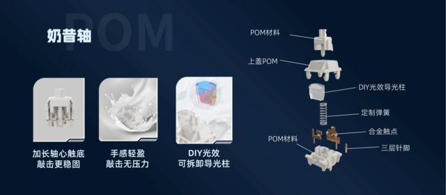 最后一款,全POM奶昔轴。轴芯、上下壳都采用POM材料,POM材料具有耐腐蚀,抗冲击的优点,可有效降低轴体摩擦系数,延长寿命,不易受到腐蚀和氧化性损害,越用越顺滑。轴体加长轴芯设计,让触底声音更集中、手感顺滑敲击无压力。奶昔轴还采用可拆卸导光柱的设计,用户可以根据个人喜好自定义导光柱,打造个性化rgb灯效。