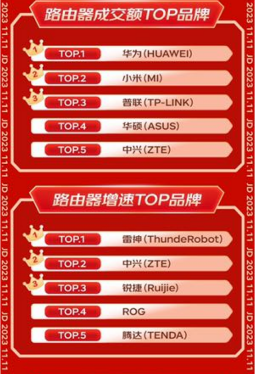 无论办公学习,还是游戏娱乐,稳定的网络都是消费者的刚需。基于京东全屋Wi-Fi等趋势产品,广大消费者的网络使用诉求正在不断得到满足,并在11.11呈现高涨的消费热情。京东11.11全周期,全屋Wi-Fi产品销量同比增长50%;5G/4G上网成交额同比增长50%,其中华为、小米、普联等品牌成为路由器成交额TOP品牌,小米Redmi路由器AX6000、华为凌霄子母路由Q6E、小米路由器AX3000T等产品则凭借安装便捷、覆盖效果好等优势成为路由器成交额TOP单品。