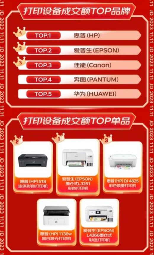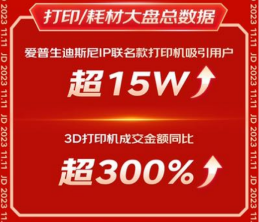 随着科技的不断发展,打印机的使用范畴更为广泛,京东11.11的激光打印机、喷墨式打印机、3D打印机等产品依旧受到消费者的喜爱。京东11.11全周期,爱普生迪士尼IP联名款打印机吸引超15W用户购买,3D打印机成交额同比超3倍。惠普、爱普生、佳能等品牌登上打印设备成交额TOP品牌名单,爱普生墨仓式L3251打印机、惠普518打印机、惠普DJ4825打印机也成为了打印设备成交额TOP单品。