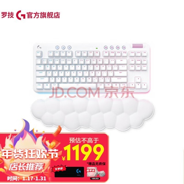 最后要提到的是罗技(G) G715极光无线机械键盘,它是一款充满潮流元素的键盘,配有GX机械轴和RGB灯效。此外,键盘还附赠一块云朵形状的手腕垫,触感舒适。并且,您可以选择无线方式连接,不必担忧数据遗失问题。