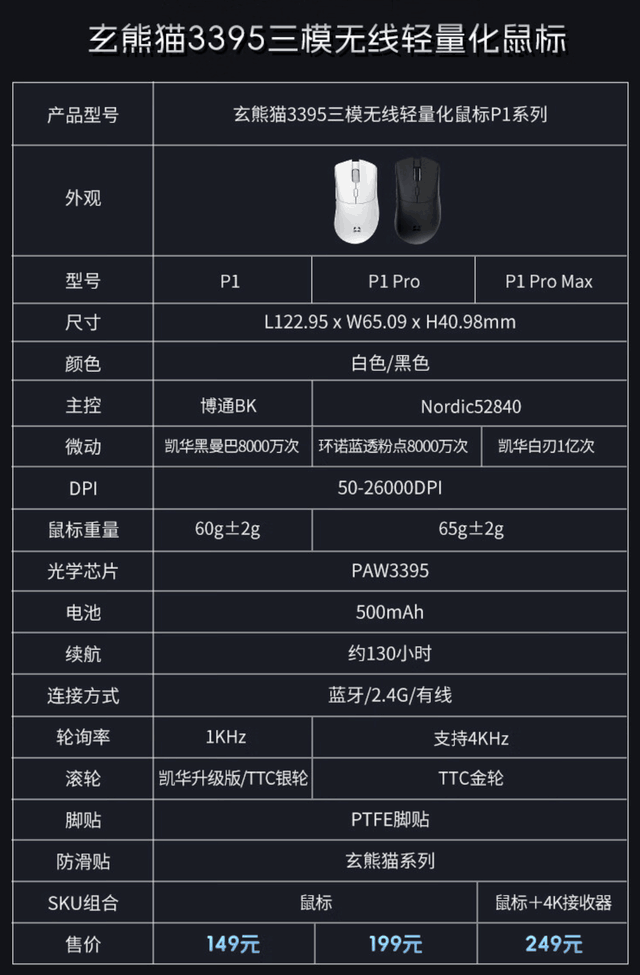 玄熊猫P1 Pro Max左右微动采用凯华白刃,使用寿命超过1亿次,支持毫秒精准触发,手感回弹非常紧凑快捷。但需要注意的是,Pro版本采用了8000万寿命的环诺蓝透粉点微动,考虑到Pro。 Max版本还附有一个4K接收器。建议你一步到位直接买顶级版本,性价比更高。您还可以查看下面的对比图,以了解更多不同版本的细节。