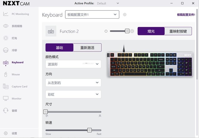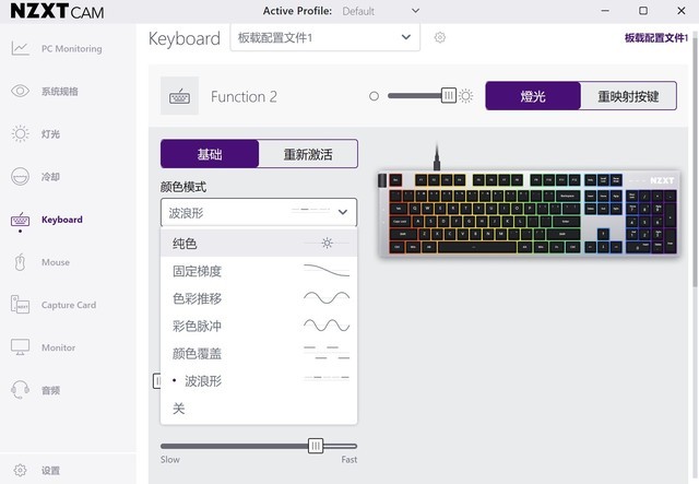 NZXT 通过NZXXTXTion2键盘可以通过NZXXXTX 除键盘外,CAM软件还可以调节任何其他NZXT产品。在NZXTT中。在CAM软件中,我们可以调整六种灯光效果的颜色模式,结合颜色、方向、尺寸和速度设置,每个按钮可以独立调整光效果,可以实现相当丰富的灯光效果。