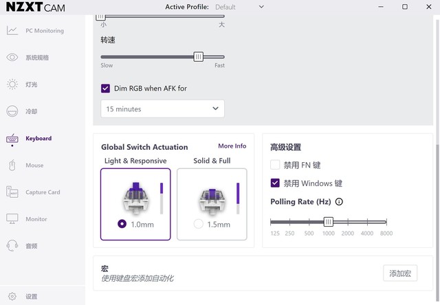 同时,在这个软件中,我们可以定制键的键程、轮询率和设置宏键。默认情况下,该键盘为1000Hz轮询率,需要在软件中调整才能达到8000Hz。但是,高轮询价率对CPU有一定的要求,有些老U可能达不到理想的效果,可以根据需要进行调整。